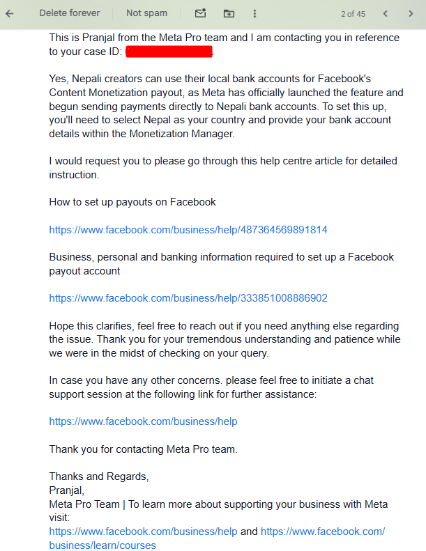 मेटाले आफ्नो जवाफमा भनेको छ, “हो, नेपाली कन्टेन्ट क्रिएटरले फेसबुकको कन्टेन्ट मनिटाइजेसनबाट प्राप्त हुने रकमका लागि आफ्नो स्थानीय बैंक खाता प्रयोग गर्न सक्छन । किनभने मेटाले यो सुविधा आधिकारिक रूपमा सुरु गरेको छ र नेपाली बैंक खातामा सिधै भुक्तानी पठाउन थालेको छ ।”